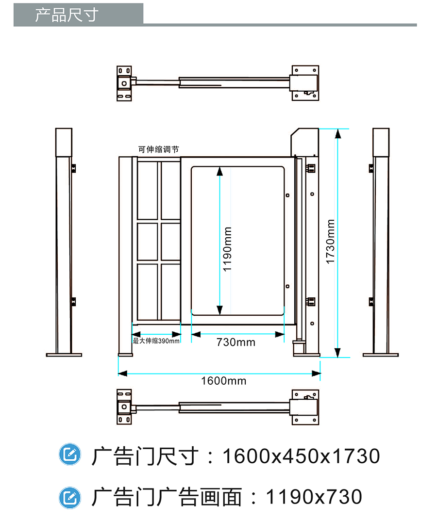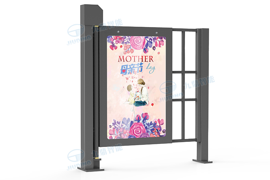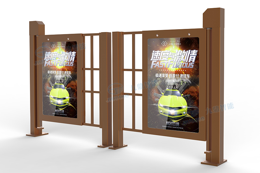 整體由鋁型材組裝而成,運送方便、易于安裝、造型美觀,門扇的前后兩面以及兩扇門之間的空隙均可安放廣告畫面。