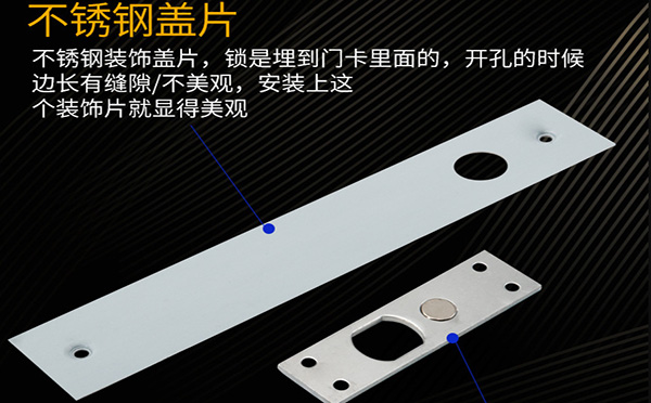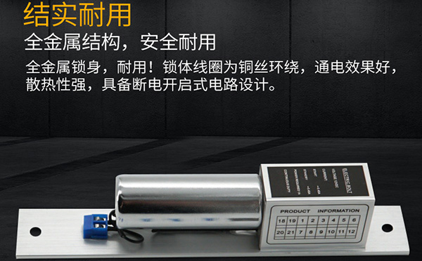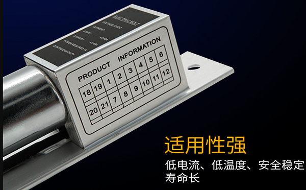 電插鎖是一種電子控制鎖具,由鎖體鎖扣板兩部分組成,安裝在門框橫梁內(nèi)部及門扇頂部,通過電流的通斷驅(qū)動鎖舌的伸出或縮回以達(dá)到鎖門或開門,可與門禁系統(tǒng)配套使用。