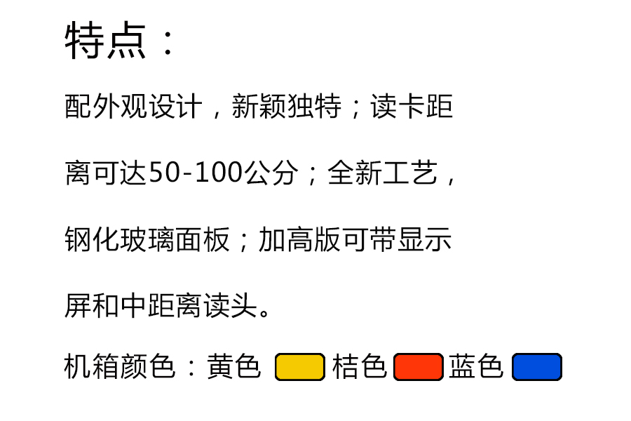 采用金屬冷鋼板制作,結(jié)構(gòu)輕巧,讀卡區(qū)面板用有機(jī)玻璃制作,不會(huì)影響讀卡郊果。